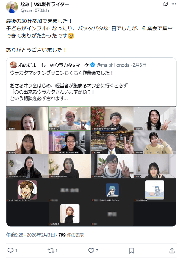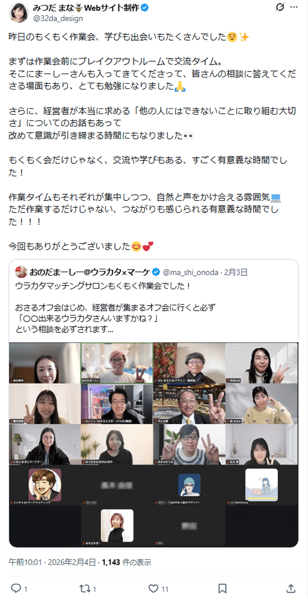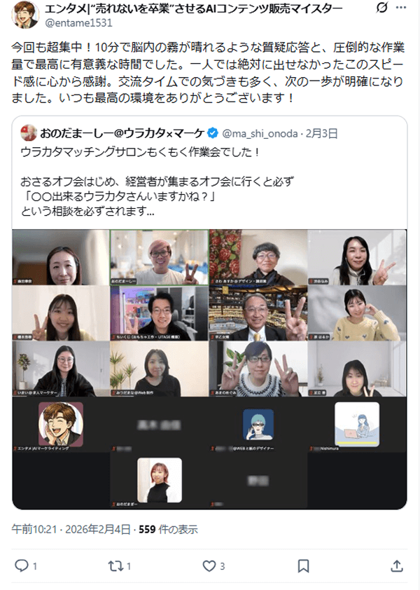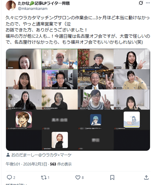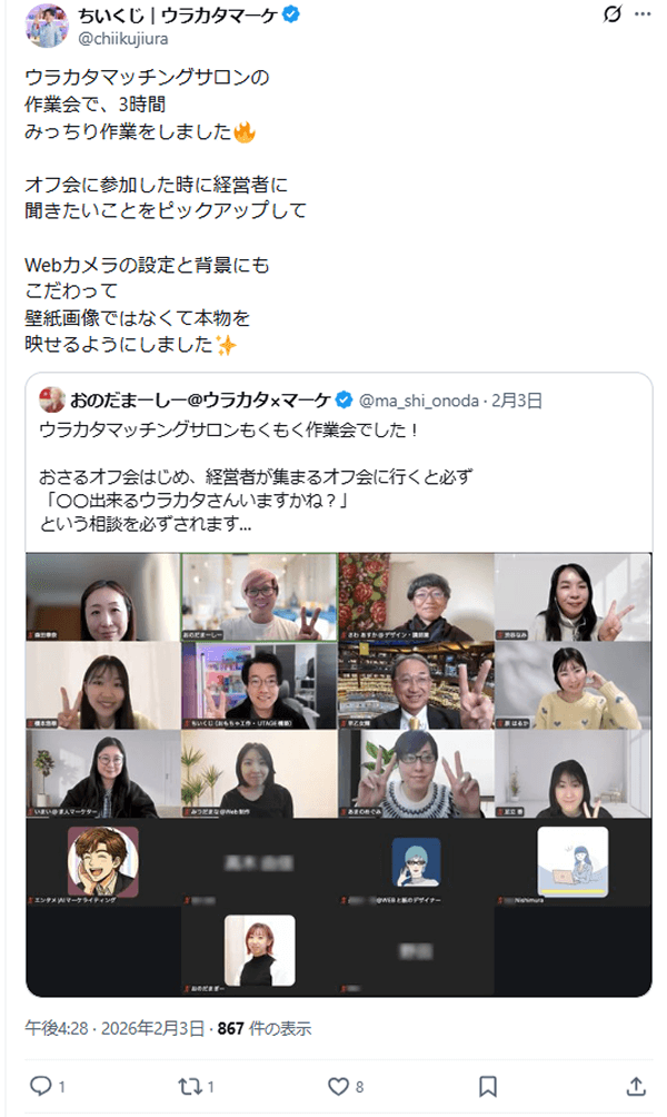 最近、オフ会をきっかけにしたマッチングが非常に増えています。 僕自身もサロンの皆さんに直接お仕事を依頼することが増えており、顔を覚えてもらうことは、そのまま信頼や仕事に直結します。