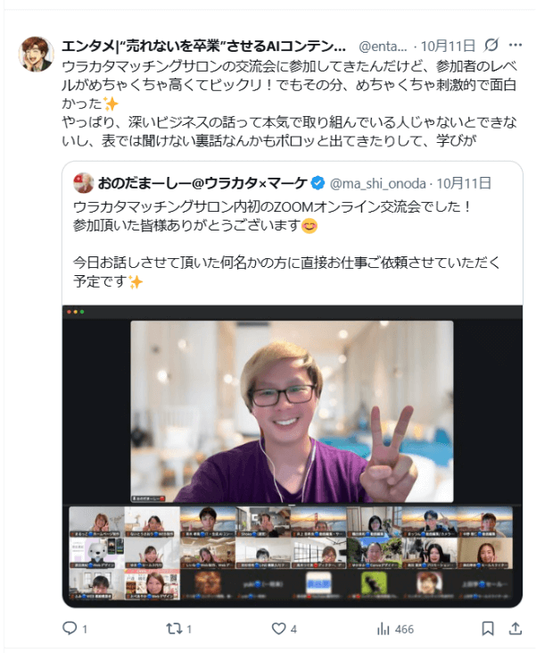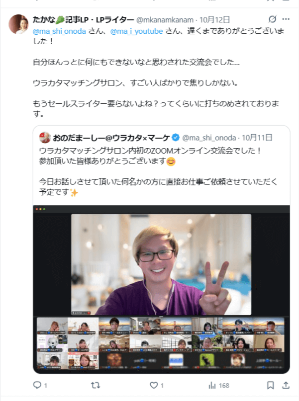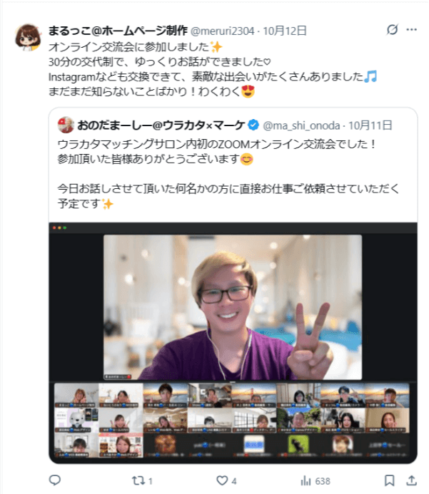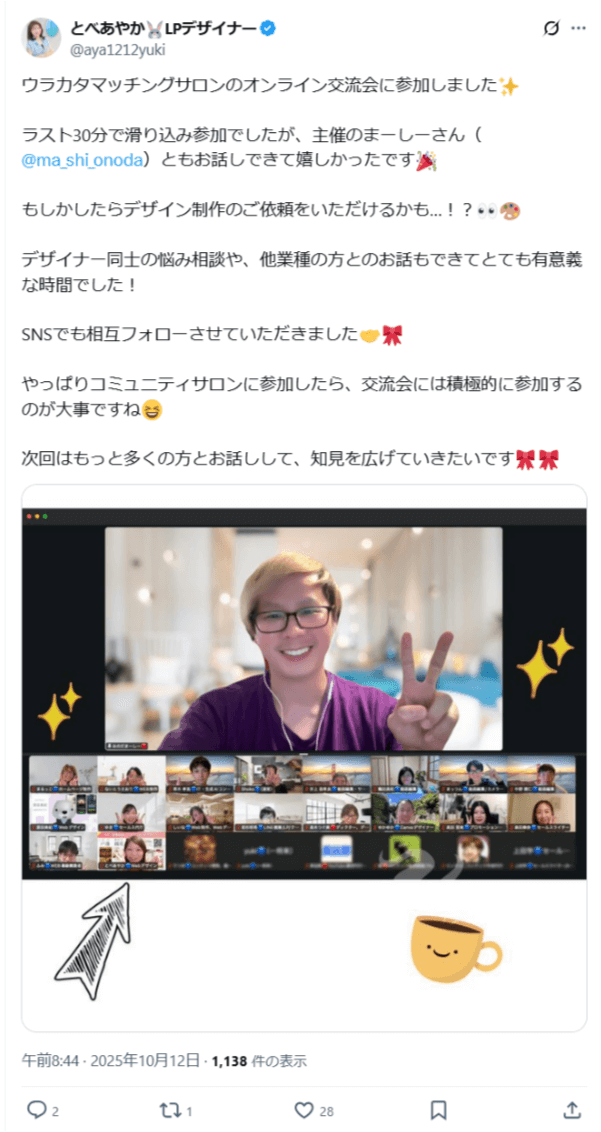 初めてのZOOMオンライン交流会でたくさんの方と直接お話しできて、楽しかったです。