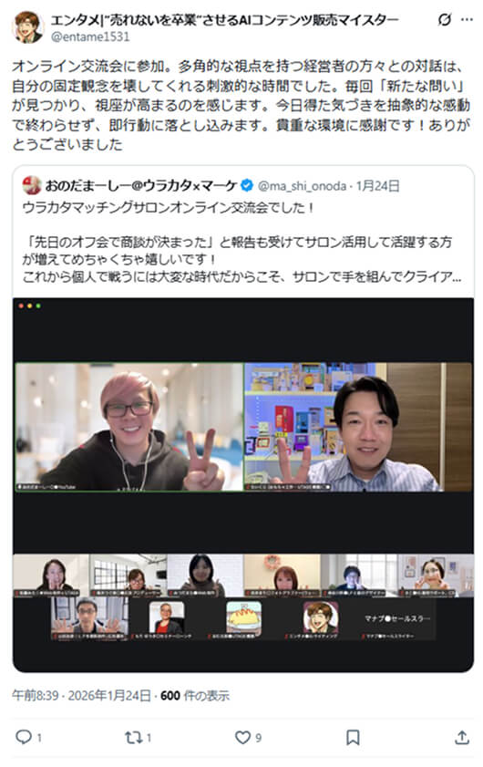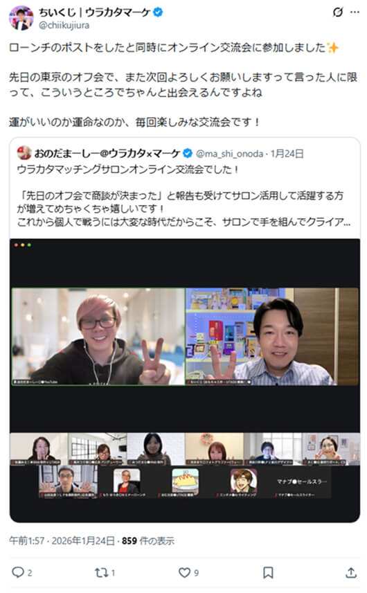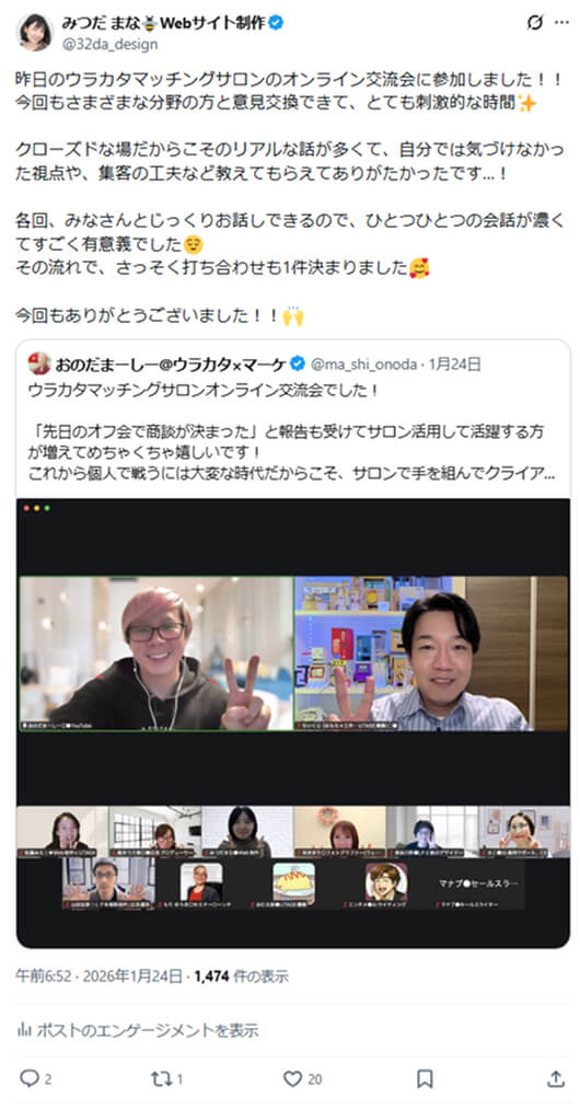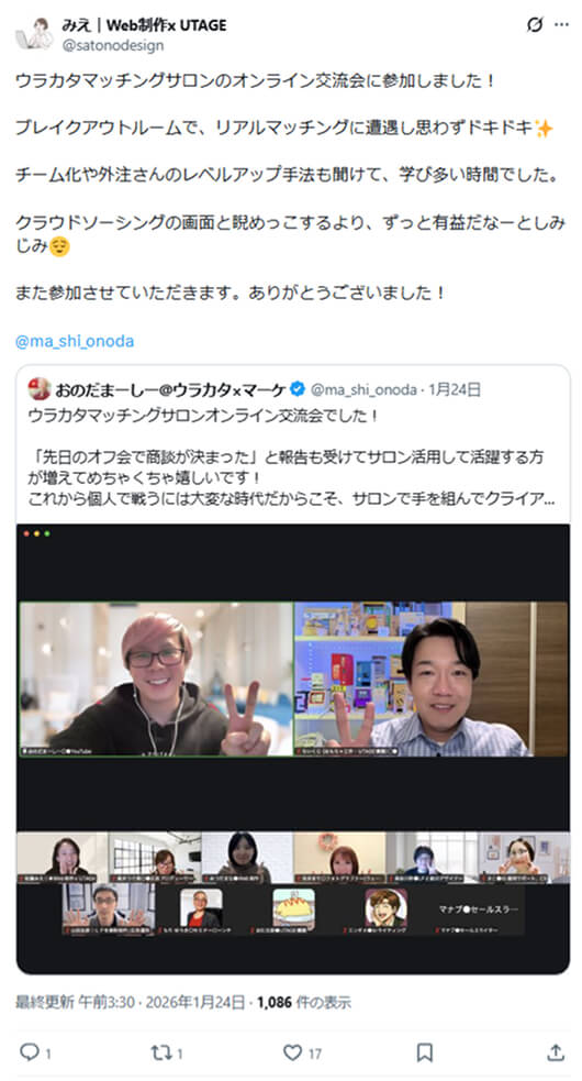 「先日のオフ会で商談が決まった」という報告をいくつも受けて、ウラカタマッチングサロンを活用して活躍する方が増えているのが嬉しいです!